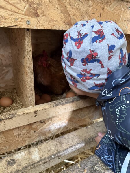 Vor Ort konnten die Schülerinnen und Schüler ihr Wissen nun direkt anwenden und erweitern. Sie konnten Hühner streicheln, das Verhalten der Tiere beobachten und erfuhren, wie Hühner gehalten werden. Besonders spannend war es, die frischen Eier zu entdecken und mehr darüber zu erfahren, wie aus einem Ei ein Küken entsteht.